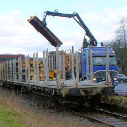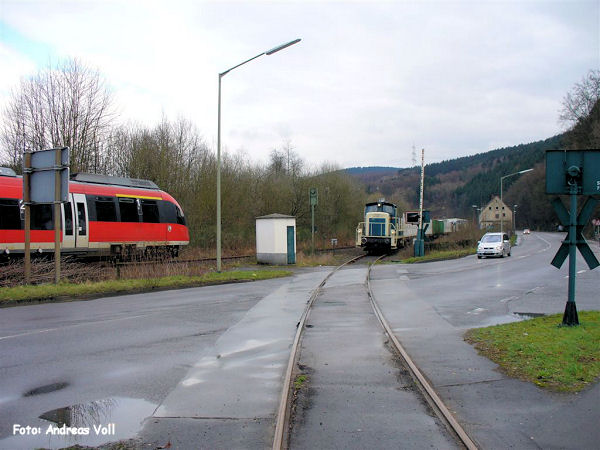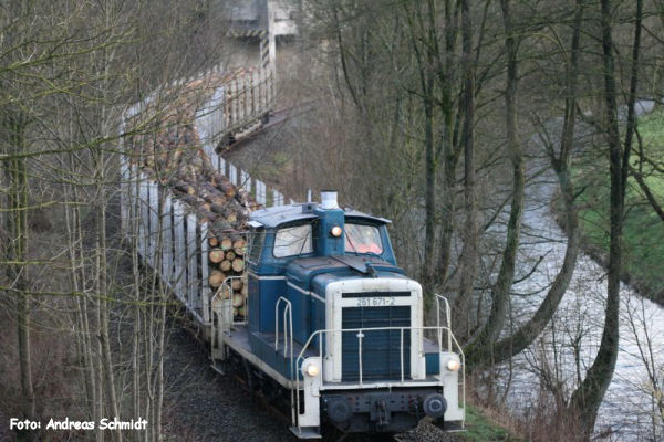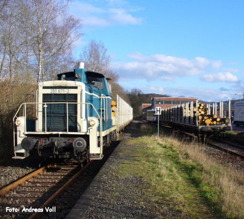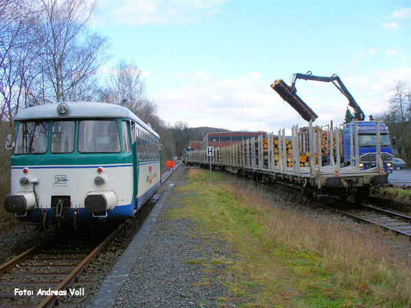 Der erste Zug des regelmäßigen Holzverkehrs: Am frühen Morgen des 7. März 2007 in Osberghausen: